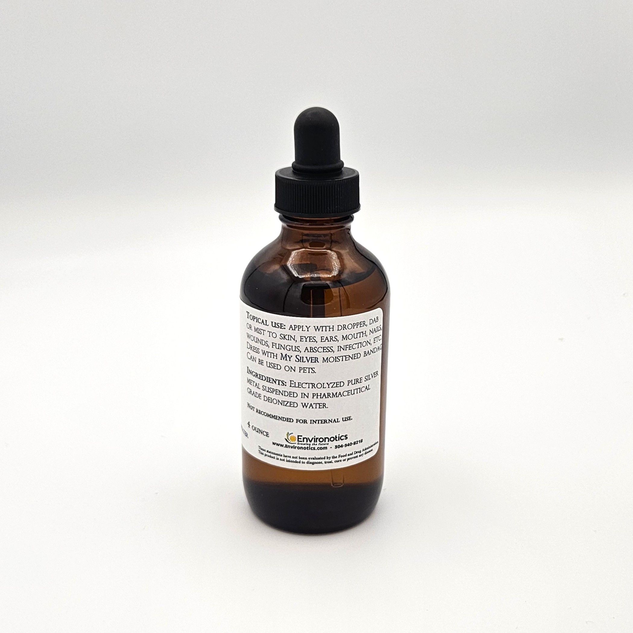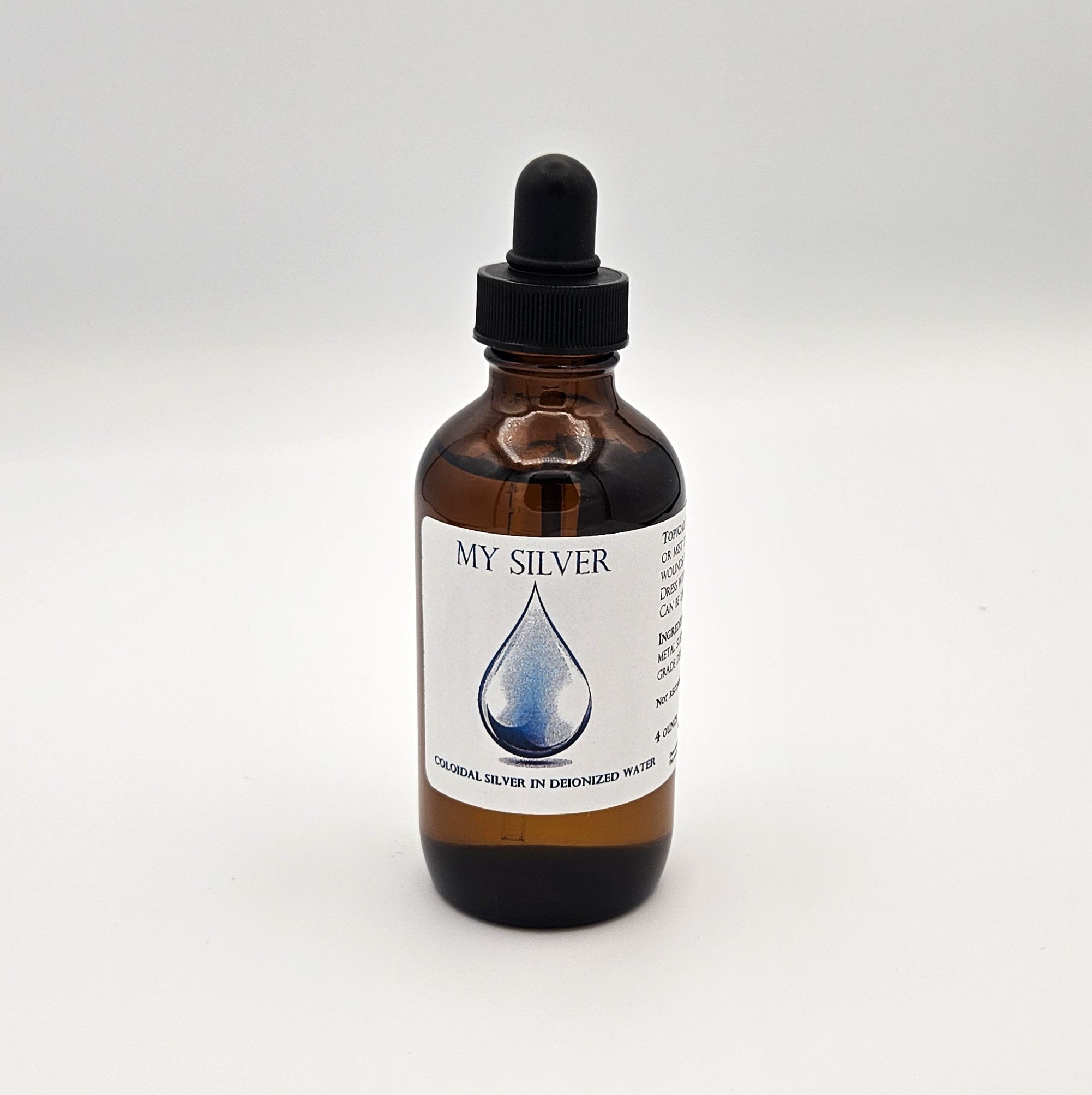Four ounces of colloidal silver in deionized water. Can be taken internally or used externally to clean skin, rinse sinuses, clear eyes, or clean wounds.