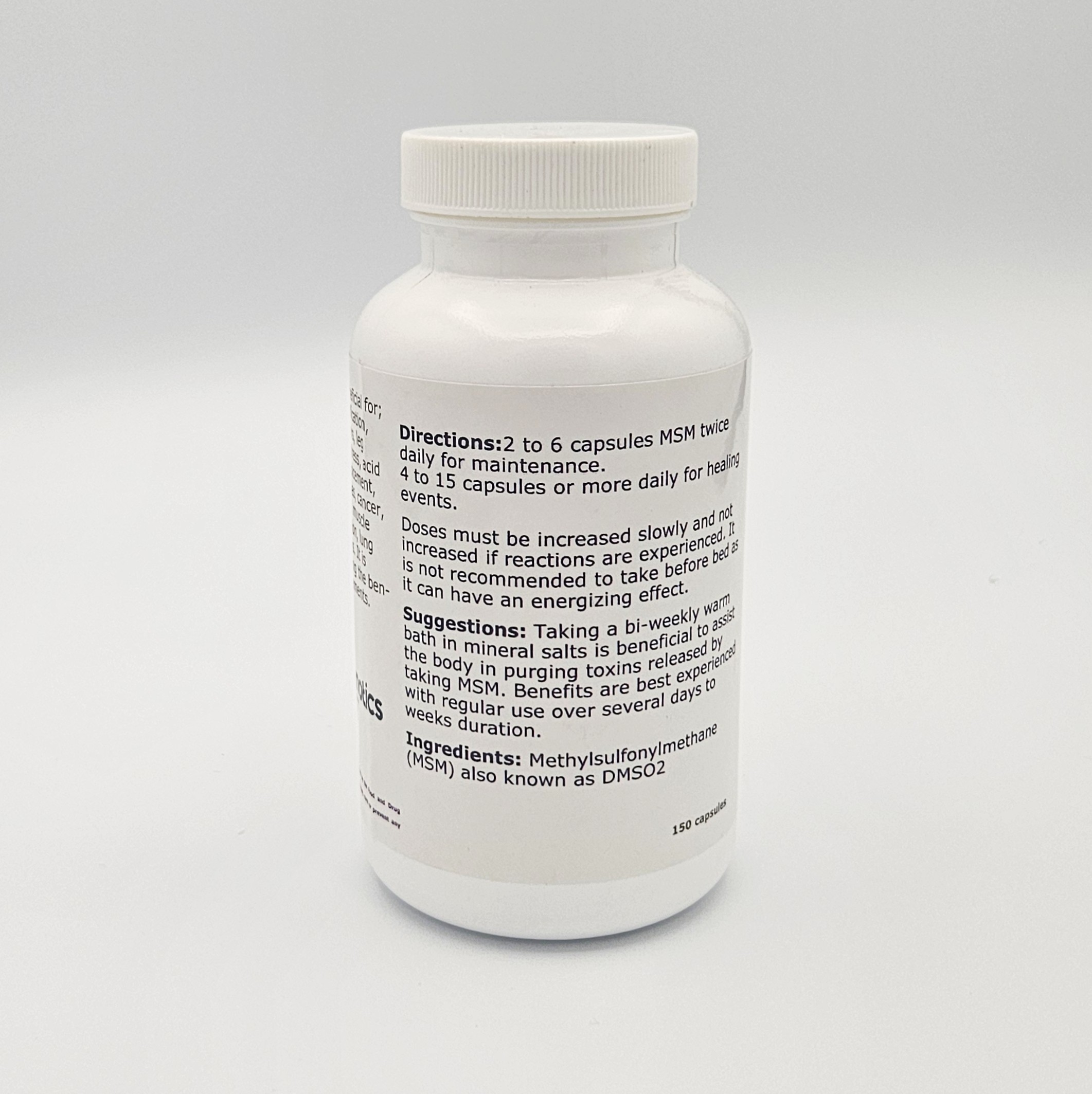 Additional Suggestion: Taking a bi-weekly warm bath in mineral salts is beneficial to assist the body in purging toxins released by taking MSM. Benefits are best experienced with regular use over several days to weeks duration.