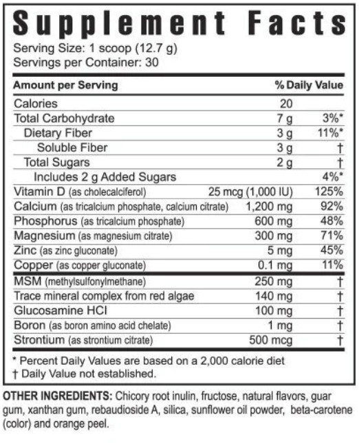 Ingredients: Vitamin D3, Calcium, Phosphorus, Magnesium, Zinc, Copper, MSM, Glucosamine Sulfate KCI, Boron, Strontium, Plant derived mineral complex, inulin, fructose, citrus peel extract, citric acid, natural flavors, stevia, natural color, sunflower EFA, guar gum.